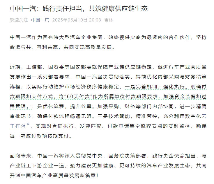 6月10日晚,中国一汽官微发文表示,近期,工信部、国资委等国家部委就保障产业链供应链稳定、促进汽车产业高质量发展作出一系列部署要求,中国一汽坚决贯彻落实,持续优化内部采购与财务结算流程,以实际行动维护市场经济秩序健康稳定。
